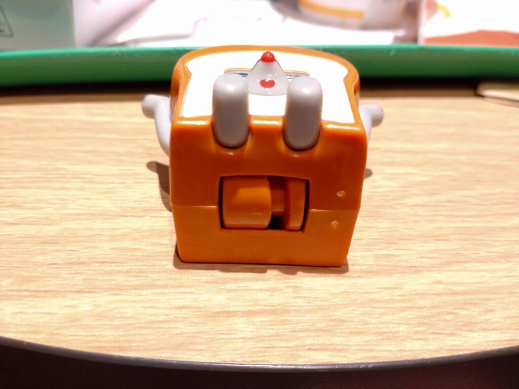 下にはローラーが付いていて、パンどろぼうをコロコロ前後に転がすと、頭の上にのったマックのハッピーボックスが左右に動く仕組みになっています。