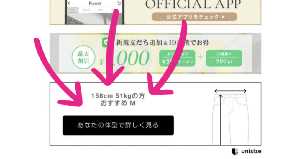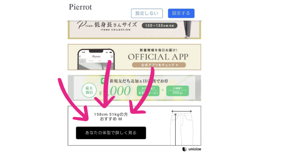 ピエロの公式サイトでは身長や体重、よく着るブランド服などを入力すると、おすすめサイズを教えてくれるので、それを参考に注文しました。