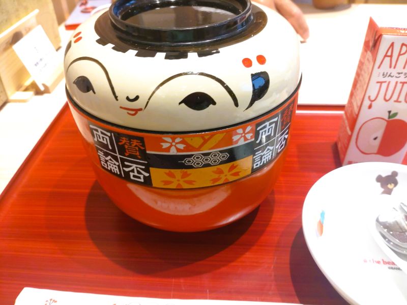 お子様御膳はこんなかわいい「こけし」の器でした!りんごジュースも付いています。